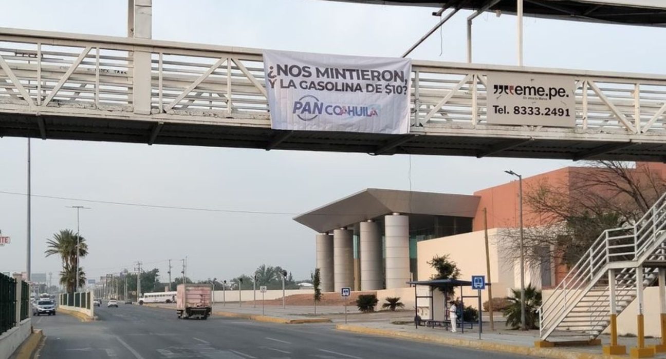 La mañana de este miércoles, en distintos puntos del Estado, se encontraron lonas del PAN Coahuila con la leyenda “¡Nos mintieron ¿Y la gasolina de 10 pesos?”, haciendo alusión a los altos precios que se han registrado en la gasolineras de todo el país.
